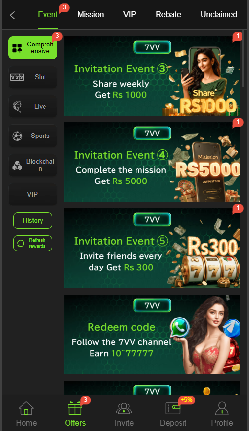 In 7VV Bet Game, daily rewards are provided to players through login bonuses, spin rewards, referral points, and limited-time events. These opportunities encourage players to extend their balance and playing time without always having to deposit.